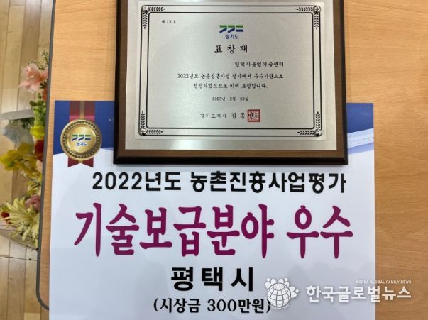 (한국글로벌뉴스 - 박소연 기자) 평택시는 지난 29일 경기도농업기술원에서 열린 ‘2022년 농촌진흥사업 종합평가회’ 시상식에서 기술보급분야 우수기관상을 수상했다.