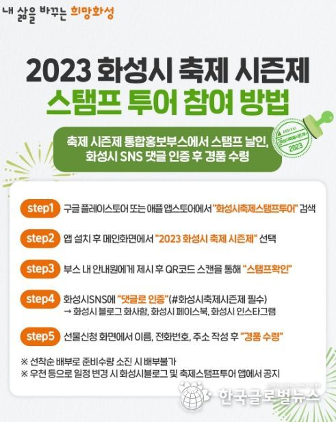 (한국글로벌뉴스 - 박소연 기자) 화성시가 5월부터 오는 10월까지 열리는 주요 축제를 대상으로 ‘축제 시즌제 스탬프투어’를 진행한다.