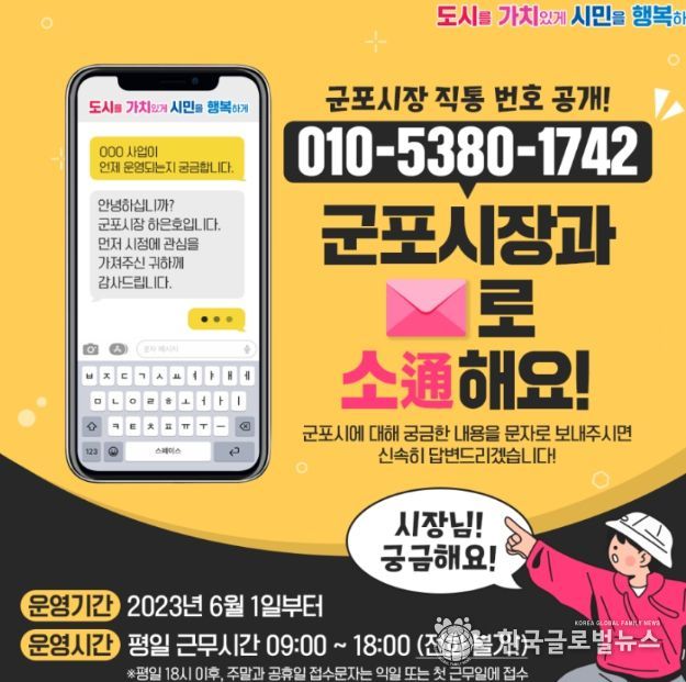 (한국글로벌뉴스 - 박소연 기자) 군포시는 시민과의 협력증진으로 도시 가치를 높이기 위해 새로운 소통방식인 ‘시장 직통 문자 서비스’를 6월 1일부터 시행하고 있다고 밝혔다.