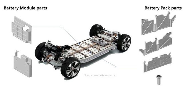 생산 및 납품하는 전기차 부품으로는 DC case 부품과 전기차 2차 전지의 직접적인 보호 역할이 아닌 배터리 모듈을 탑재하기 위한 배터리 팩 부품으로서 전기차 배터리 부품 7종이 있다.