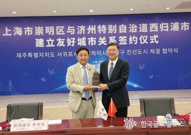 (한국글로벌뉴스 - 김폴로 기자) 서귀포시는 28일 서귀포시교류자문단과 함께 중국 상해시 충밍구를 방문하여 상해 충밍구청장, 관계 공무원, 의원, 양 도시 민간단체 및 기업 등 관계자 50여명이 참여한 가운데 충밍구 컨벤션센터에서 친선 도시 체결식을 개최했다.