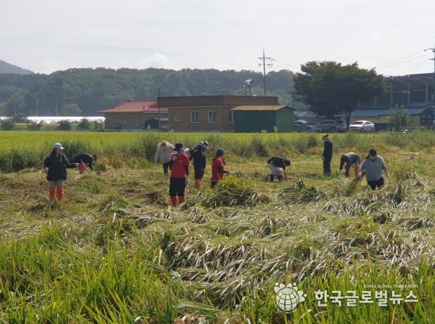 (한국글로벌뉴스 - 박소연 기자) 중앙대학교 4-H회는 지난 22일 벼 도복 피해를 입은 안성시 삼죽면 소재의 논에서 농촌봉사활동을 실시했다. 11명의 회원들은 기계작업이 어려운 도복된 벼 수확작업을 지원하며 구슬땀을 흘렸다.