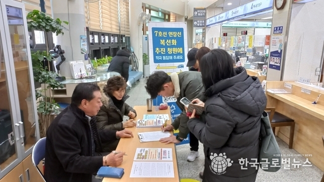 (한국글로벌뉴스 -박소연 기자) 의정부시 송산2동주민센터(동장 이형순)은 송산2동 주민자치회(회장 이상붕)가 1월 27일까지 ‘7호선 연장선 복선화 추진 서명운동 및 도민청원’을 진행하고 있다고 밝혔다.
