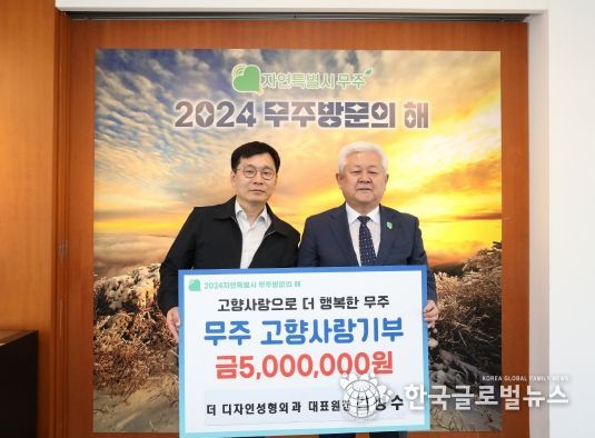 (한국글로벌뉴스 - 박소연 기자) ‘무주사랑’의 마음이 고향사랑 기부로 확산되고 있다. 무주군에 따르면 대전광역시 서구 ‘더 디자인성형외과’ 김성수 대표 원장이 지난 11일 성금 5백만 원을 기탁해왔다고 밝혔다.