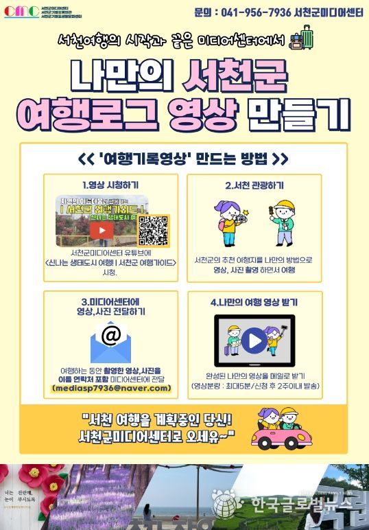 (한국글로벌뉴스 - 김정현 기자) 서천군미디어센터는 서천 관광 활성화와 서천을 찾는 관광객을 위해“서천여행의 시작과 끝은 미디어센터에서”라는 슬로건으로 영상제작 프로그램 '나만의 서천군 여행로그 영상 만들기'를 운영한다.