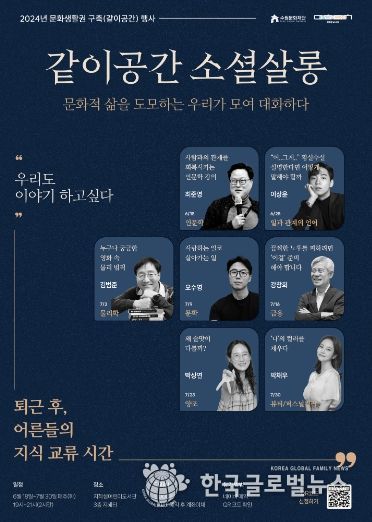 (한국글로벌뉴스 - 박소연 기자) 커피 한 잔의 여유와 지적 대화를 나눌 수 있는 특별한 소셜살롱이 집 근처 도서관에 준비되어 있다. 수원문화재단 문화도시센터는 나이, 직업 등에 상관없이 비슷한 취향을 가진 사람을 모아, 유명 인사와 함께 대화하는 교류의 장을 펼칠 예정이다. 같이공간 소셜살롱에서 유명 인사는 소셜장으로 불린다.