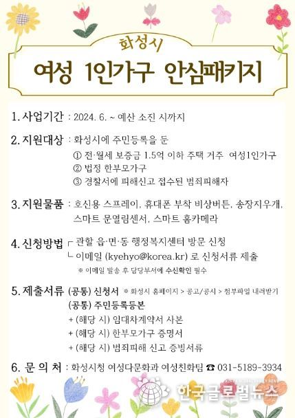 (한국글로벌뉴스 - 박소연 기자) 화성시가 범죄대응 능력이 취약한 여성 1인 가구 등 사회적 약자에게 방범(호신)물품 꾸러미를 지급하는 ‘2024년 여성 1인 가구 안심패키지 지원 사업’을 실시한다고 24일 밝혔다.