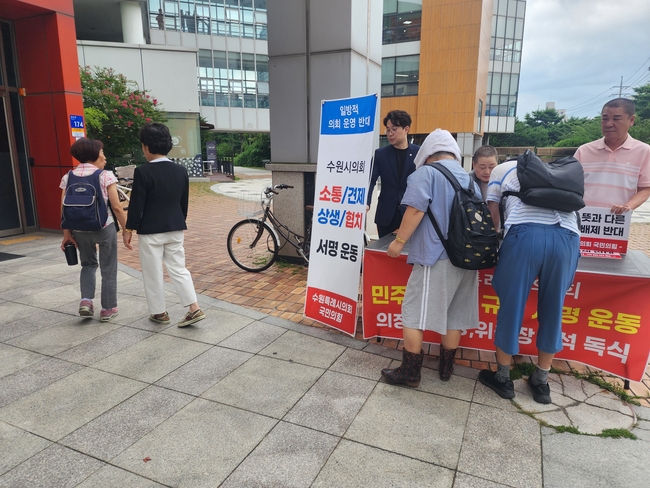 (한국글로벌뉴스 -박소연 기자) 수원특례시의회 국민의힘 의원들은 7월 16일 12시부터 SK청솔 복지관 앞에서 더불어민주당의 일방적인 의회 운영에 반대하는 시민 서명 운동을 시작했다.