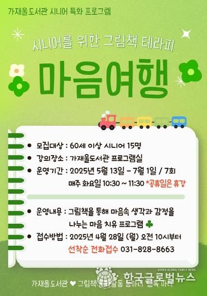 (한국글로벌뉴스 - 박소연 기자) 의정부가재울도서관은 60세 이상 시니어를 위한 그림책 테라피 프로그램 ‘마음 여행’을 운영한다.