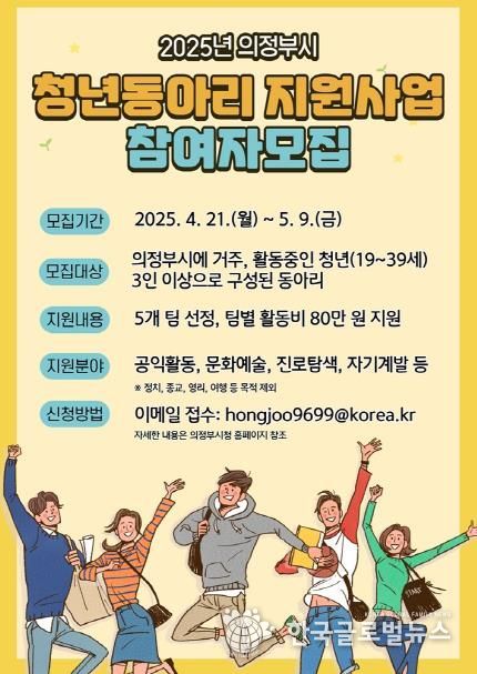 (한국글로벌뉴스 - 박소연 기자) 의정부시는 청년들의 창의적이고 자율적인 커뮤니티 활동을 장려하고자 ‘2025년 청년동아리 활동지원사업’에 참여할 동아리를 모집한다.