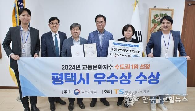 (한국글로벌뉴스 - 박소연 기자) 평택시는 지난 23일 한국교통안전공단 상주 교통안전체험교육센터에서 열린 ‘2024 교통문화지수 평가 시상식’에서 수도권 1위, 전국 2위를 차지하며 한국교통안전공단 이사장 표창을 받았다고 밝혔다.
