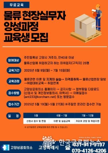 (한국글로벌뉴스 - 박종욱 기자) 고양특례시는 2025년 고양맞춤형 일자리학교 공모에 선정된 ‘물류현장실무자 양성과정’ 참여자를 19일부터 27일까지 모집한다고 밝혔다.