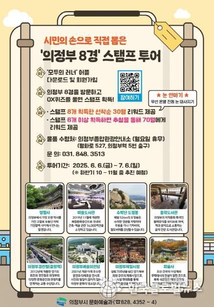 김동근 시장은 “의정부 8경 선정은 기존 행정 주도의 형식에서 벗어나 시민과 함께 만들어가는 관광정책의 첫걸음”이라며 “이번 스탬프 투어는 단순한 관광을 넘어 시민과 관광객이 직접 지역 명소를 체험하고 기억에 남길 수 있는 소중한 기회가 될 것”이라고 말했다.