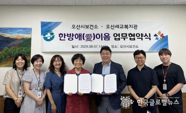 (한국글로벌뉴스 - 박소연 기자) 오산시 보건소는 지난 8월 7일 오산세교종합사회복지관과 함께 건강 취약계층의 건강 사각지대 해소를 위한 ‘한방애(愛) 이음’ 협력사업 추진을 위한 업무협약을 체결했다고 밝혔다.