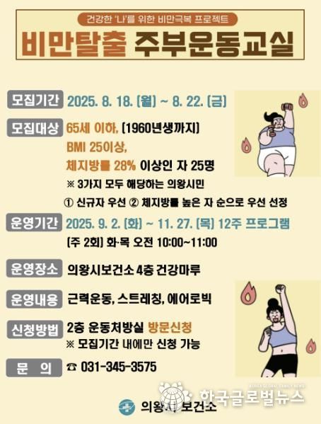 (한국글로벌뉴스 - 박소연 기자) 의왕시 보건소는 오는 8월 18일 부터 8월 22일까지 “건강한 ‘나’를 만나는 비만 극복 프로젝트 '비만 탈출 주부 운동 교실'”의 참여자를 모집한다고 밝혔다.