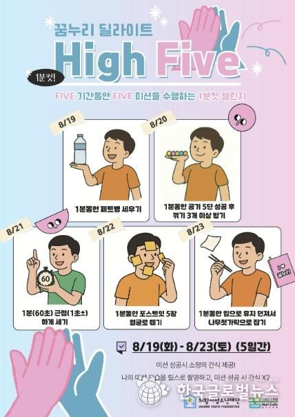 (한국글로벌뉴스 - 박소연 기자) 의왕시청소년재단 산하 의왕시청소년수련관 꿈누리카페는 오는 8월 19일부터 23일까지 5일간 꿈누리딜라이트 『1분컷 챌린지 High Five』를 진행한다고 밝혔다.