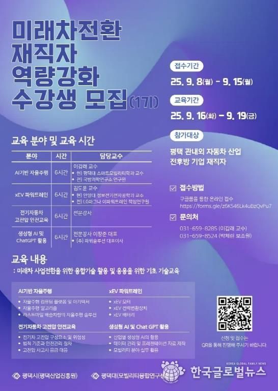 (한국글로벌뉴스 - 박소연 기자) 평택시와 평택산업진흥원은 평택대학교, KG모빌리티, 지역 내 부품사 등과 협력해 ‘미래자동차 전환 재직자 역량 강화교육’을 2025년 9월부터 추진하며, 9월 15일까지 교육생을 모집한다. 교육 인원은 총 30명으로 한정하며, 교육 과정당 10~15명 내외 소규모로 분반하여 진행한다.