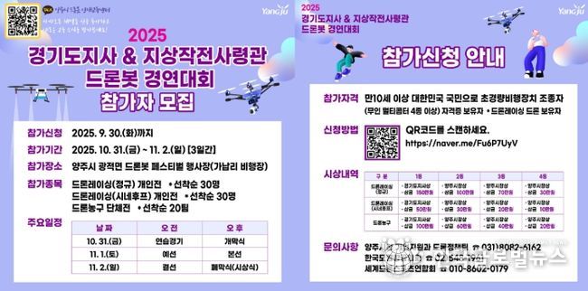 (한국글로벌뉴스 - 박종욱 기자) 양주시가 '2025 경기도지사ㆍ지상작전사령관배 드론봇 경연대회'에 참가할 일반부 선수를 오는 9월 30일까지 모집한다.