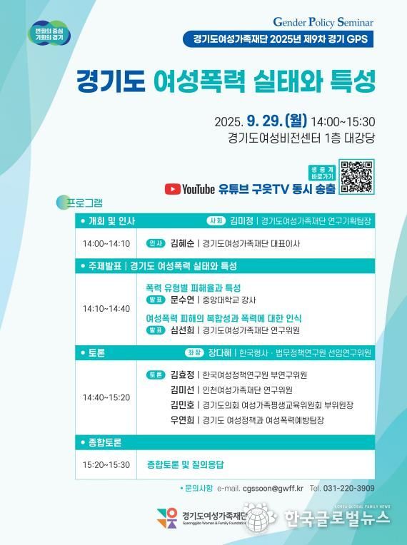 (한국글로벌뉴스 - 박소연 기자) 경기도여성가족재단은 29일 오후 2시 경기도여성비전센터 1층 대강당에서 ‘경기도 여성폭력 피해 실태와 특성’을 주제로 정책토론회를 개최한다.
