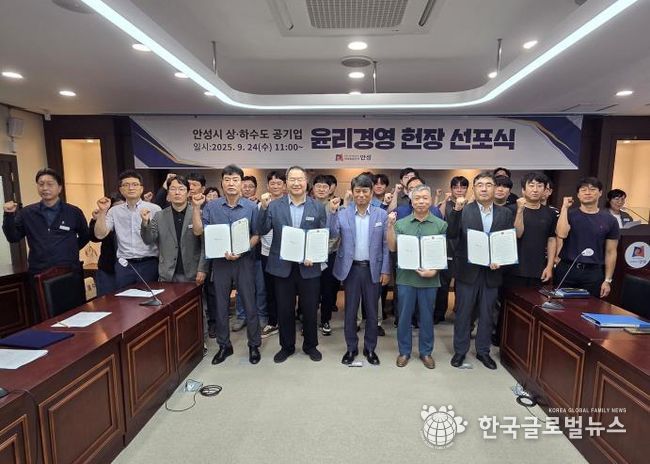 (한국글로벌뉴스 - 박소연 기자) 안성시 상·하수도 공기업이 업무 전반에 적용할 ‘윤리경영 헌장’을 제정하고 9월 24일 선포했다. 선포식은 청렴과 공정계약, 이해충돌 방지, 안전·인권, 개인정보 보호를 핵심 원칙으로 삼아 전 직원의 실천 의지를 확인하는 자리로 진행됐다.