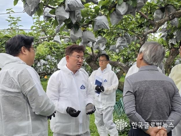 (한국글로벌뉴스 - 박소연 기자) 농촌진흥청 이승돈 청장은 지난 9월 23일 경기도 안성시 공도읍 소재 배 과수원을 방문해 생육 및 출하 상황을 점검하고, “수확 적기 판단과 철저한 수확 후 관리로 과수 안정 생산에 힘써 달라”고 격려했다.
