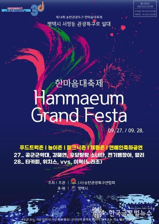 (한국글로벌뉴스 - 박소연 기자) 사단법인 송탄관광특구연합회가 주최·주관하는 ‘제14회 송탄관광특구 한마음대축제’가 오는 27일(토)과 28일(일) 양일간 송탄출장소 앞 송탄관광특구 일대에서 성대하게 열린다.