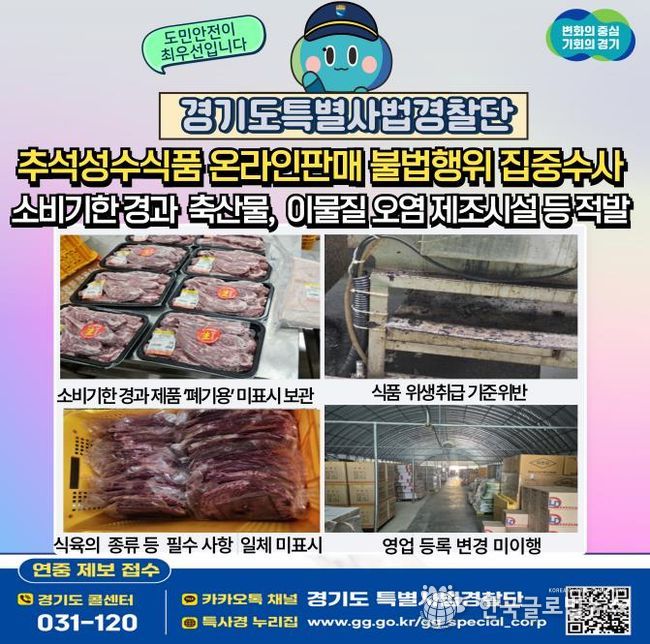 (한국글로벌뉴스 - 박소연 기자) 경기도 특별사법경찰단은 추석을 앞두고 도내 식품제조․가공업소, 축산물 가공·판매업소 360곳을 대상으로 집중 수사를 실시한 결과, 총 10건의 불법행위를 적발했다고 밝혔다.