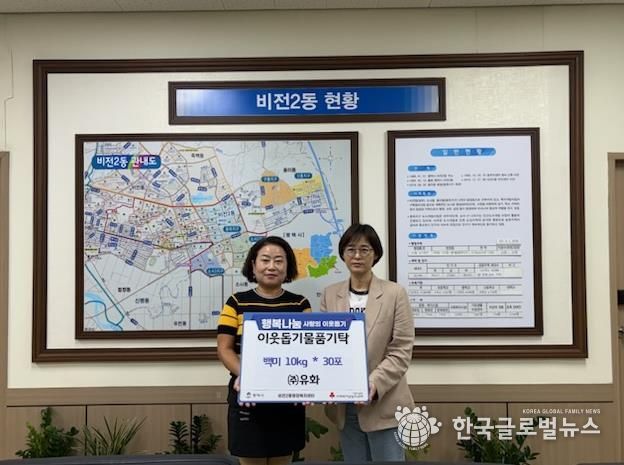 (한국글로벌뉴스 - 박소연 기자) ㈜유화는 추석 명절을 맞아 지난 29일 비전2동 행정복지센터를 방문하여 100만원 상당의 백미 30포를 전달하며 온정을 베풀었다.
