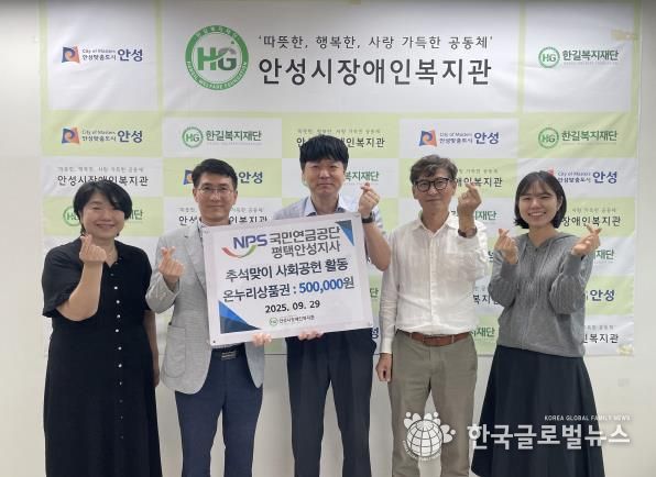 (한국글로벌뉴스 - 박소연 기자) 사회복지법인 한길복지재단에서 수탁하고 있는 안성시장애인복지관은 지난 9월 29일 국민연금공단 평택안성지사로부터 사회공헌활동으로 50만원 상당의 온누리 상품권을 후원받았다고 밝혔다.