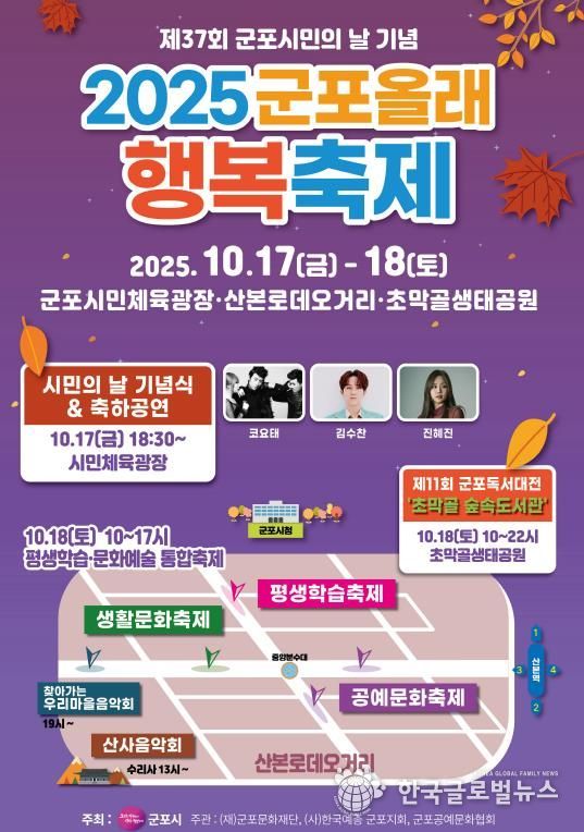 (한국글로벌뉴스 - 박소연 기자) 군포시는 제37회 시민의 날을 기념하여 오는 10월 17일부터 10월 18일 양일간 군포올래 행복축제를 개최한다.