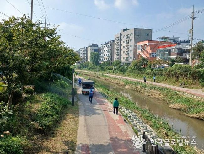 무더위가 길어지고, 이상 고온 여파로 가을 모기가 기승을 부리고 있어 모기·파리 등 위생 해충으로부터 각종 감염병을 예방하기 위해 연휴에 많은 시민이 찾는 수원천변 산책로를 방역했다.
