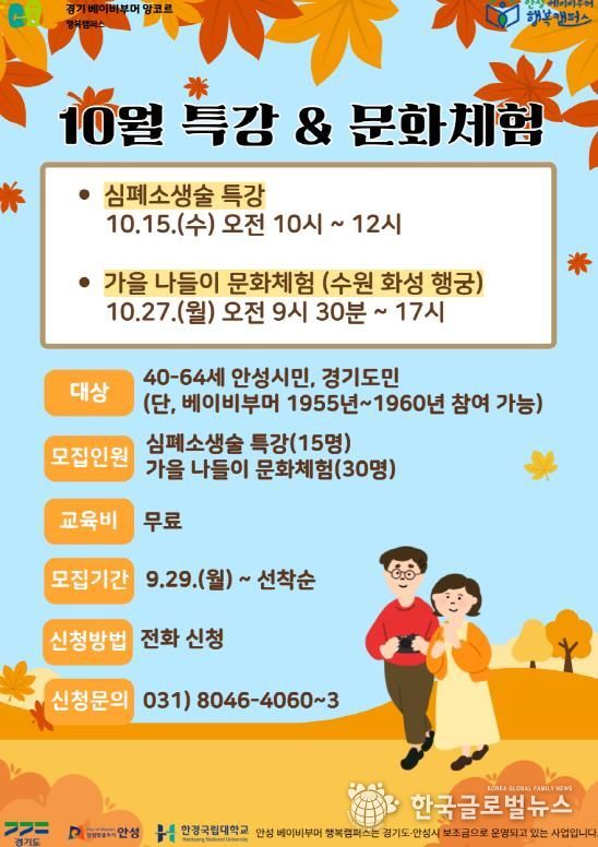 (한국글로벌뉴스 - 박소연 기자) 안성 베이비부머 행복캠퍼스(한경국립대학교 평생교육원)는 오는 10월 15일부터 27일까지 중장년 안성시민(경기도민)을 대상으로 ‘10월 특강(심폐소생술) 및 문화체험(수원화성행궁)’ 프로그램을 운영한다고 밝혔다.