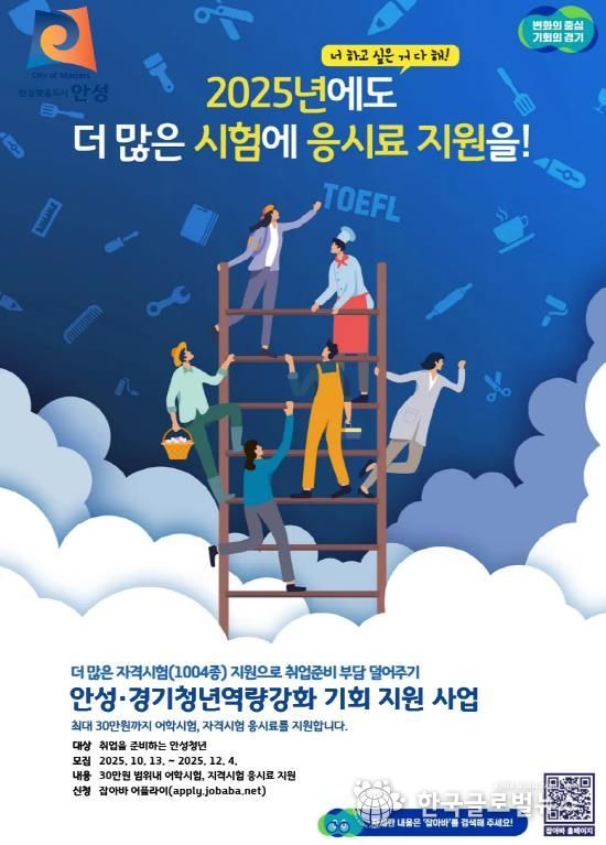 (한국글로벌뉴스 - 박소연 기자) 안성시는 예산 소진으로 한 차례 마감됐던 '안성·경기청년 역량강화 기회지원' 사업을 2025년 10월 13일 오전 9시부터 12월 4일 오후 6시까지 추가로 접수한다고 밝혔다.