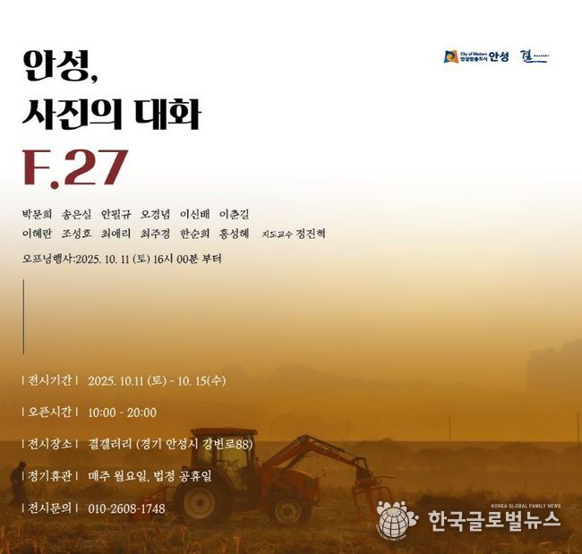 (한국글로벌뉴스 - 박소연 기자) 안성시 사진동아리 F.27 photo가 오는 10월 11일부터 15일까지 안성천 작은미술관 결갤러리에서 전시회 ‘안성, 사진의 대화 F.27’을 개최한다. 이번 전시는 동아리 회원 18명이 참여해 안성의 자연환경과 사람들의 이야기를 기록한 작품을 선보인다.