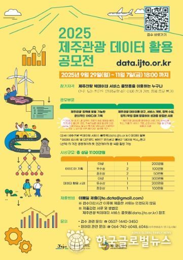 (한국글로벌뉴스 - 김정현 기자) 제주특별자치도와 제주관광공사는 오는 11월 7일까지 온라인 채널을 통해 ‘2025년 제주관광 데이터 활용 공모전’ 참가자를 모집하고 있다고 2일 밝혔다.