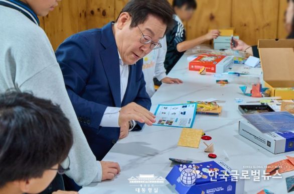 이어 명절을 맞아 딱지, 팽이 등 전통 장난감 만들기 체험을 하고 있던 아이들을 만난 이재명 대통령은 아이들과 일일이 하이파이브를 하며 인사를 나누고, 놀이를 함께했다.