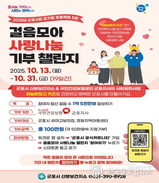 (한국글로벌뉴스 - 박소연 기자) 군포시 산본보건지소는 오는 10월 13일부터 31일까지(19일간) 국민건강보험공단 군포지사와 함께하는 '걸음모아 사랑나눔' 기부챌린지를 운영한다.