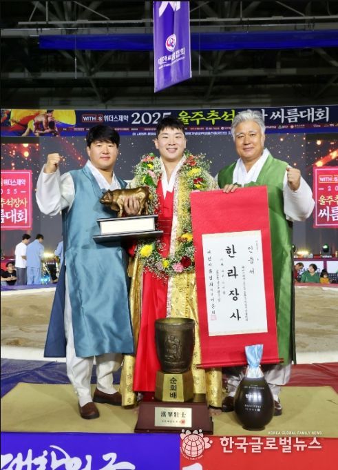 (한국글로벌뉴스 - 박지형 기자) 울주군청 해뜨미씨름단 소속 김무호 선수가 7일 울산 울주군 울주종합체육센터에서 열린 ‘위더스제약 2025 울주추석장사씨름대회’에서 한라장사에 등극했다.