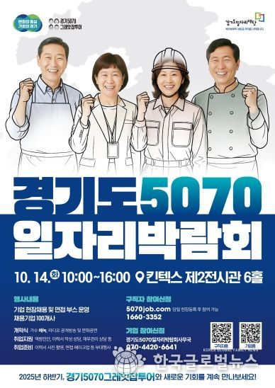 (한국글로벌뉴스 - 박소연 기자) 경기도와 경기도일자리재단은 오는 14일 고양 킨텍스에서 ‘경기도 5070 일자리 박람회’를 개최한다. 이번 박람회는 경기 북부권을 중심으로 열리며, 50~70대 중장년 구직자와 기업의 직접 연결을 통해 재취업 기회를 넓히는 자리다.