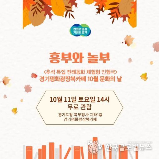 (한국글로벌뉴스 - 박소연 기자) 경기도가 오는 10월 11일 경기평화광장 북카페 원형무대에서 추석 연휴를 맞아 전래동화 인형극 공연 ‘흥부와 놀부’를 공연한다. 이번 행사는 ‘10월 문화의 날’ 프로그램으로, 도민에게 명절의 의미를 되새기고 가족과 함께하는 특별한 시간을 제공하기 위해 기획됐다.