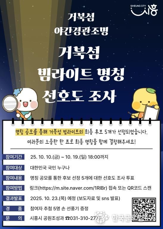 최종 명칭은 선호도 조사 결과를 반영해 10월 23일 시 보도자료 및 시흥시 공식 누리소통망(SNS)을 통해 발표될 예정이다. 아울러, 참여자 중 추첨을 통해 5명에게 2만 5천 원 상당의 손 선풍기가 경품으로 제공된다.