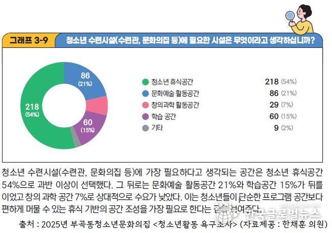 부곡동청소년문화의집 응답 청소년의 절반 이상인 54%는 청소년 전용 휴식공간이 필요하다고 답했고, 포일 청소년문화의집 조사 역시 가장 필요한 공간으로 휴식공간을 1순위(36%)로 꼽았다.