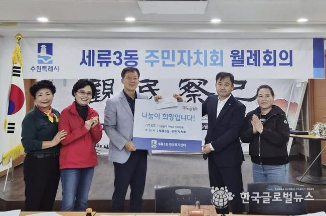 (한국글로벌뉴스 - 박소연 기자) 수원시 권선구 세류3동 주민자치회는 지난 10월 1일, 세류3동 행정복지센터에 방문해 추석 명절 세류3동 불우이웃을 위한 100만원 후원금을 전달했다.