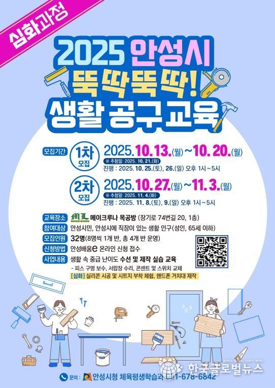 (한국글로벌뉴스 - 박소연 기자) 안성시는 시민들의 생활 자립 역량 강화를 위해 '뚝딱뚝딱 생활 공구[심화과정] 교육'을 오는 10월 25~26일과 11월 8~9일, 총 2회 주말 일정으로 운영한다고 밝혔다.