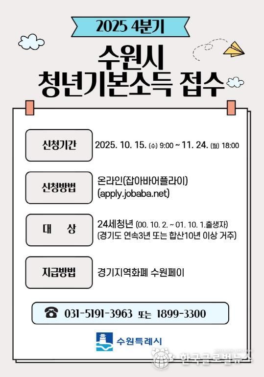(한국글로벌뉴스 - 박소연 기자) 수원특례시는 10월 15일 오전 9시부터 11월 24일 오후 6시까지 24세 청년을 대상으로 ‘2025년 4분기 청년기본소득’ 신청을 받는다.