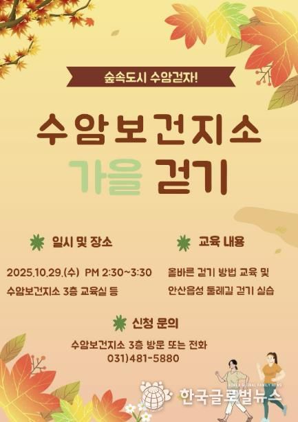 (한국글로벌뉴스 - 박소연 기자) 안산시 상록수보건소 수암보건지소는 지역 주민의 건강증진을 도모하기 위해 ‘수암 가을 걷기 교실’ 참가자를 모집한다고 14일 밝혔다.