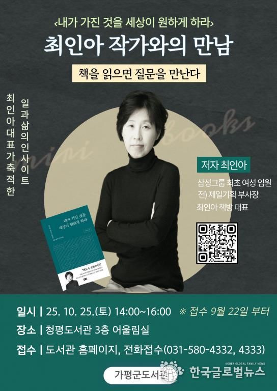 (한국글로벌뉴스 - 박소연 기자) 가평군은 이달 25일 오후 2시 청평도서관에서 ‘2025년 정기 작가와의 만남’ 강연을 개최한다. 이번 강연은 ‘최인아 책방’ 대표로 잘 알려진 최인아 작가를 초청해 ‘책을 읽으면 질문을 만난다’를 주제로 열린다.
