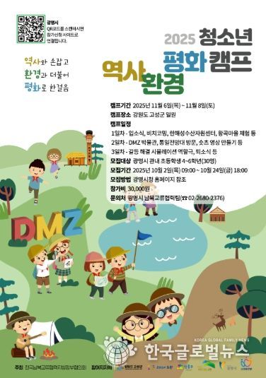 (한국글로벌뉴스 - 박소연 기자) 광명시는 전국남북교류협력지방정부협의회가 주최·주관하는 ‘2025 청소년 역사·평화·환경캠프’에 참가할 청소년을 모집한다.