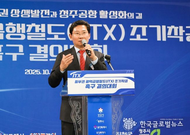 이 시장은 이날 오후 청주국제공항 여객청사에서 열린 ‘중부권 광역급행철도(JTX) 조기착공 촉구 결의대회’에서 지난 8월 국토교통부가 한국개발연구원에 의뢰한 민자적격성 조사가 신속하게 통과돼 철도 신설을 위한 착공이 조기에 이뤄져야 한다고 강조했다.