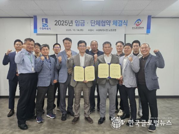 (한국글로벌뉴스 - 박소연 기자) 수원특례시는 14일 수원시청 노동조합(환경관리원)과 ‘2025년 임금 및 단체협약’을 체결했다.